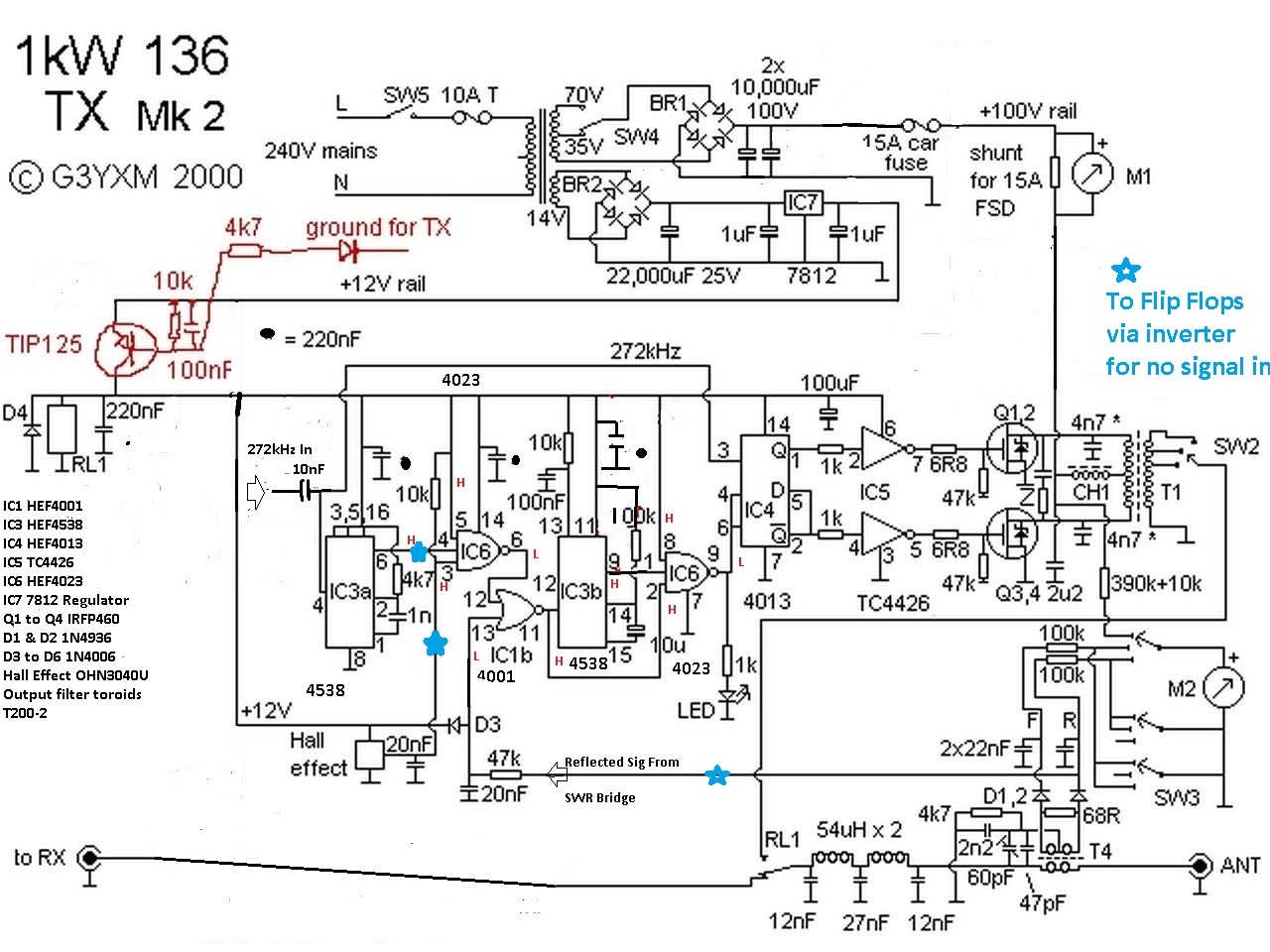 Before embarking on improving the high reflected power trip I had to feed the flip flop from the bridge side of the 47k resistor, just before the voltage limiting diode D3. I am unsure just what the 47k resistor does, is it current limiting?