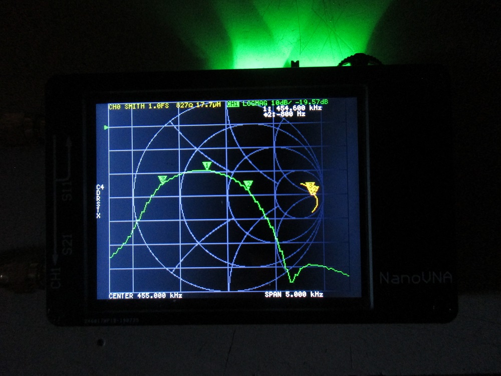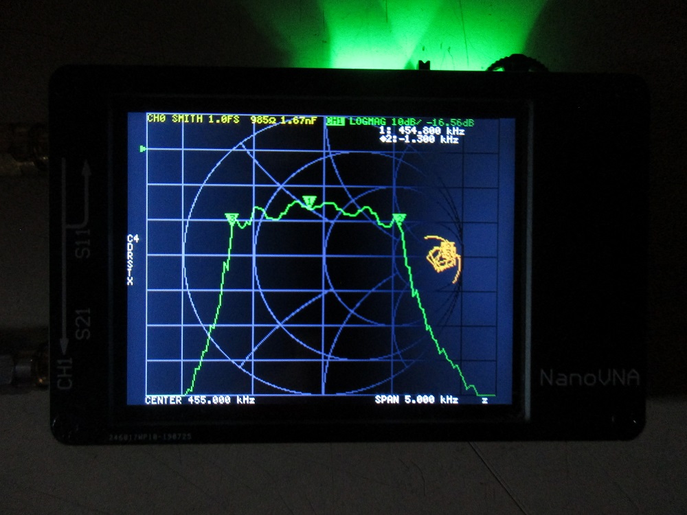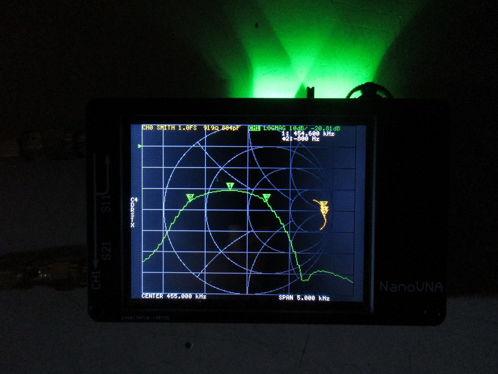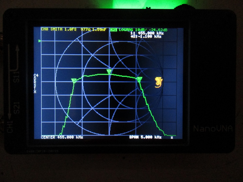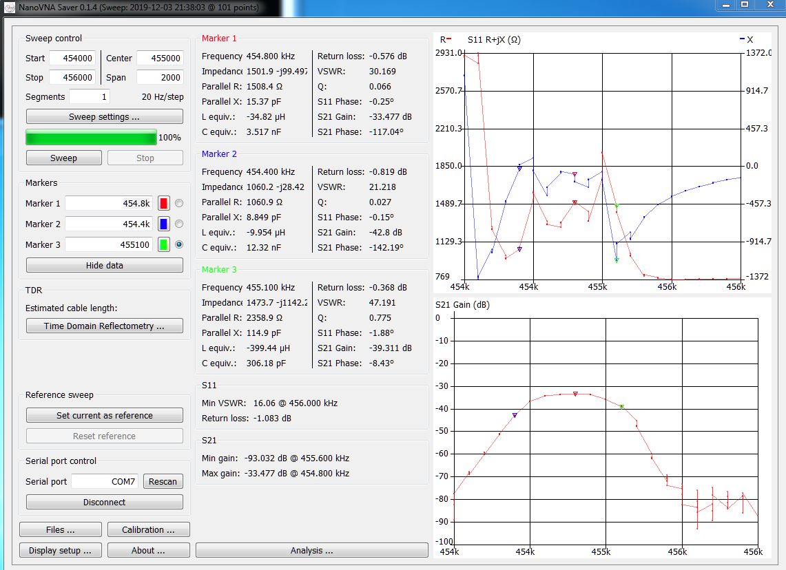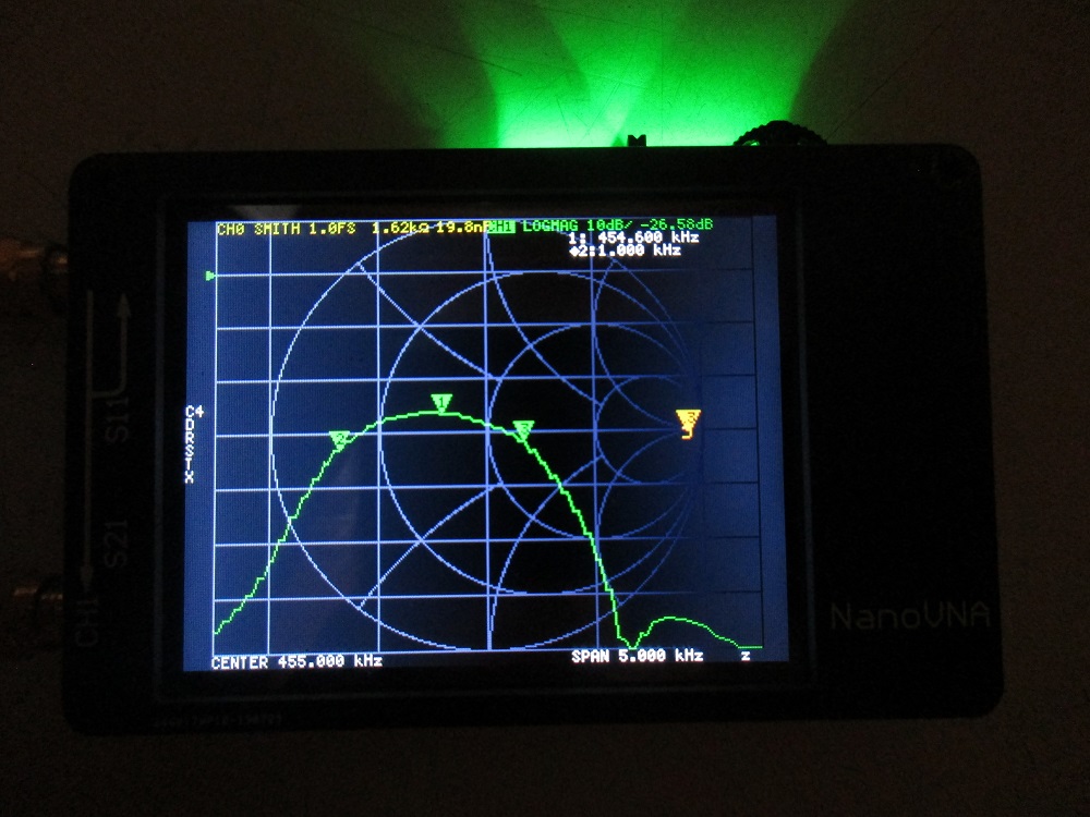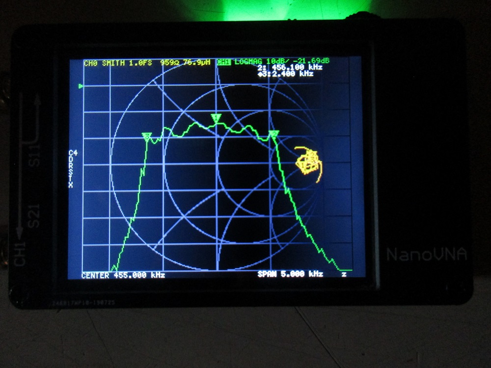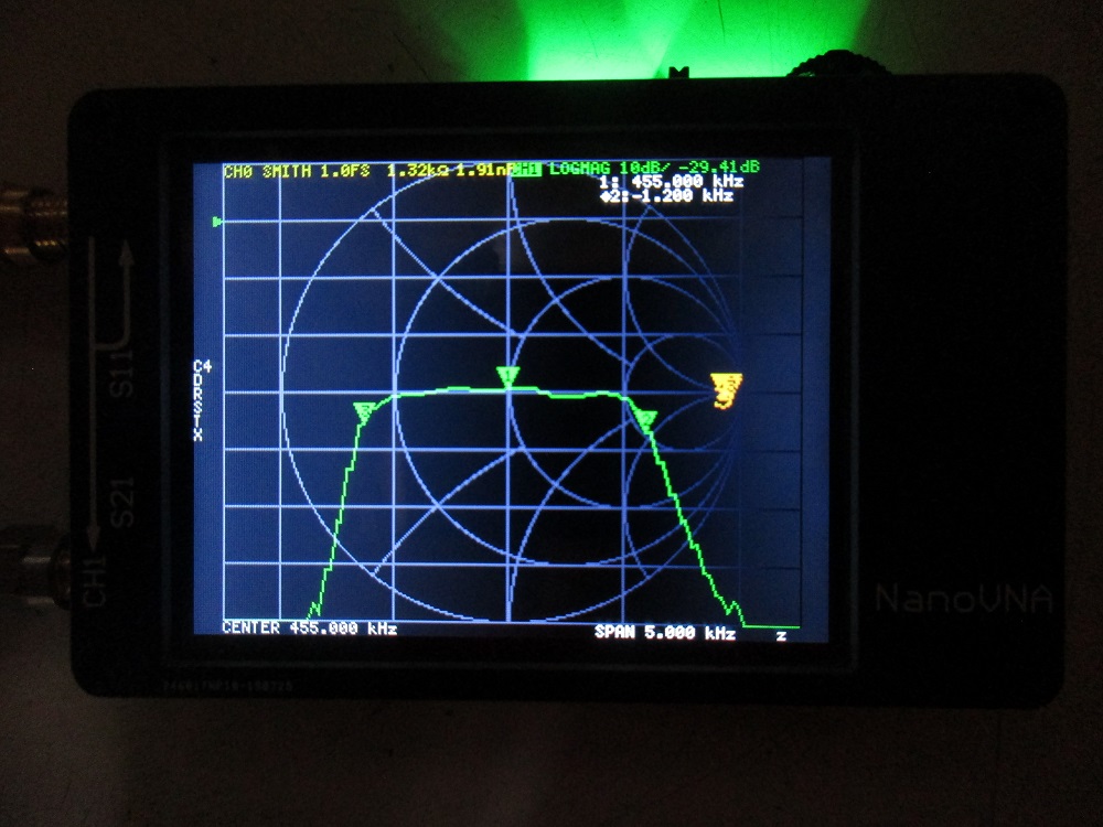 Instead of a photo of the nanoVNA, the software nanoVNASaver version 1.4 was used. The software has the advantage that it allows more types of output for S11. The capture shows S11 as an r + jx output while S21 is log-magnitude.