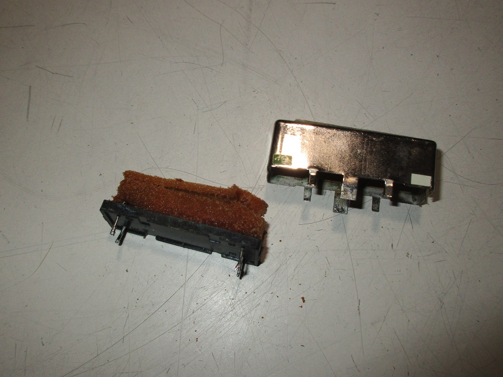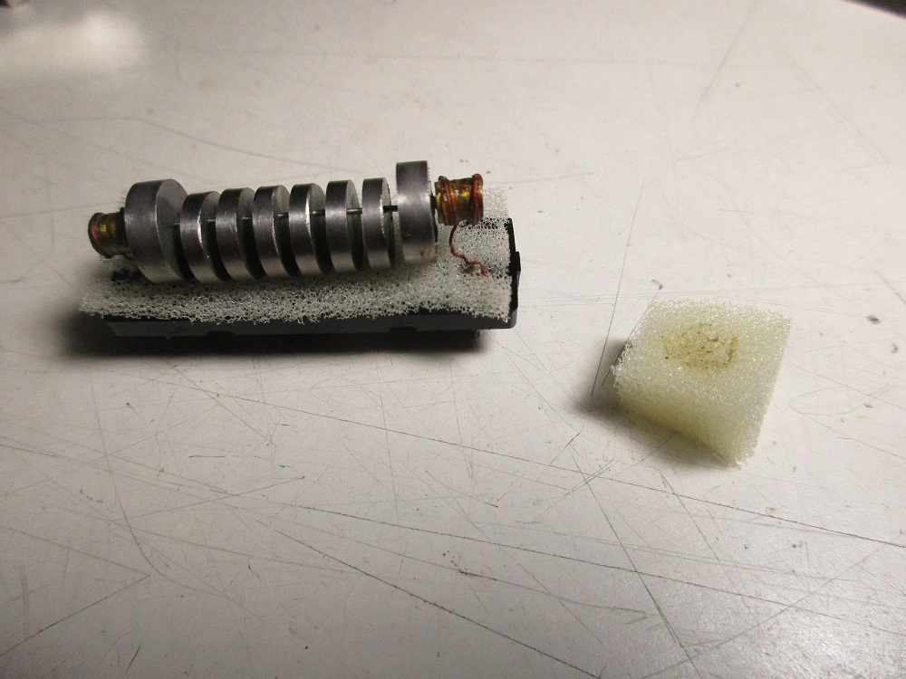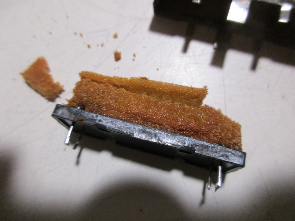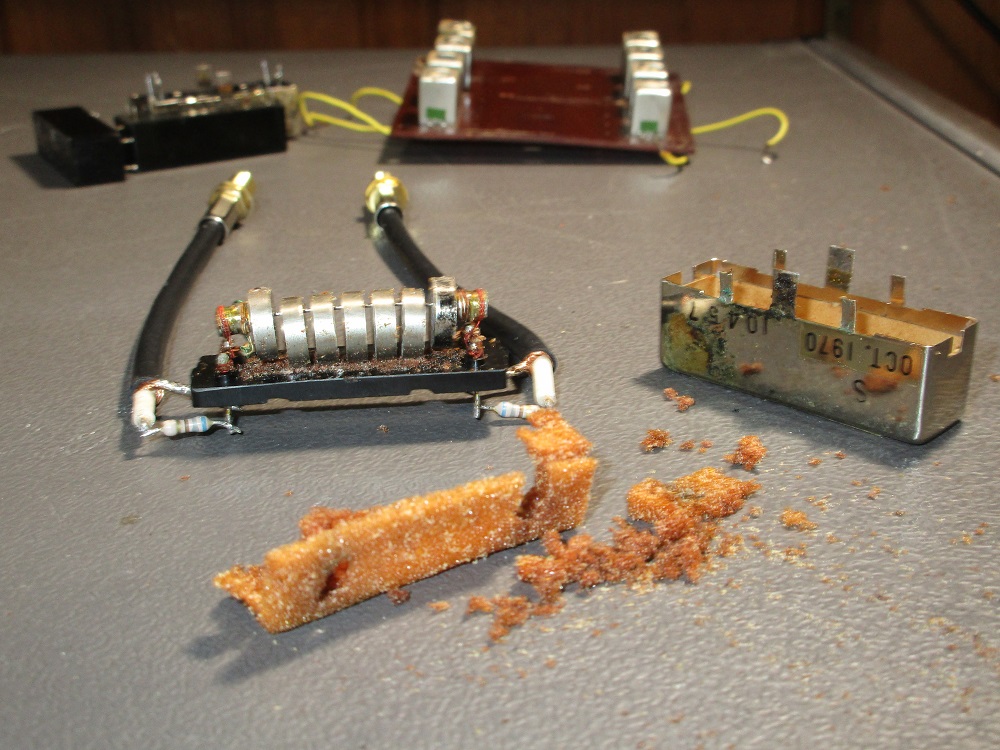One of the Kokusai filter has the labelling scrubbed off but a test shows it is likely the same filter repaired above but with slightly narrower bandwidth and more loss most likely due to some degradation. The MF-455-03AZ27 is a 600 Hz filter. It shows the most degradation with more than 20 dB loss. It was disassembled and repaired the same as above. Below is a photo taken during the clean up process. It was very similar in condition to the above filter in that the foam was crumbly but for the most part intact. Again the center elements of the filter were stuck to the plastic base.