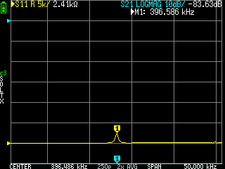 Working with the first transducer with the clean response, by carefully positioning the endcap the frequency of the response has been moved up to 414 khz but still too low. This seems like a very delicate operation to get the frequency correct. It may require a fixture to do it with sufficient accuracy.