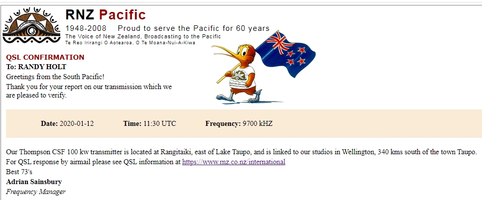 I hear RNZI usually most mornings in the 49 meter band, even when conditions are otherwise seemingly marginal. If you're in California, perhaps try early mornings. Can't remember the frequency, but on 49 meters RNZI put out an amazingly solid signal.