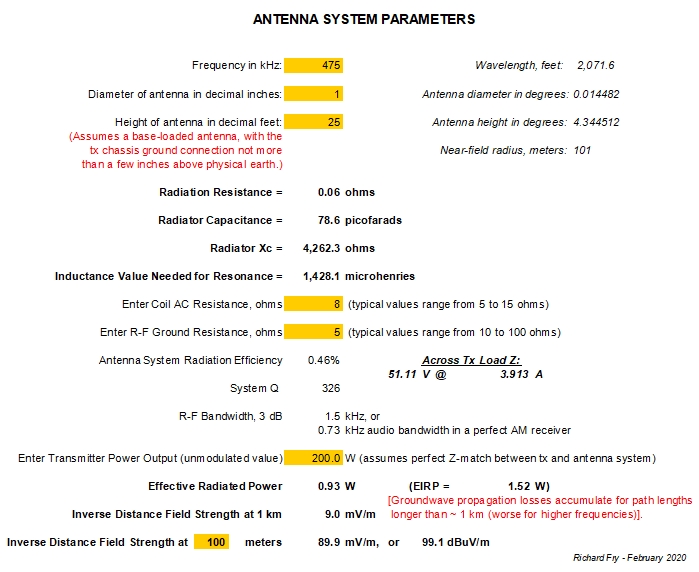 ... If my numbers are correct one can meet the 5 watt EIRP FCC limit using a modest vertical driven with less than the 500 watt FCC max RF power. ...