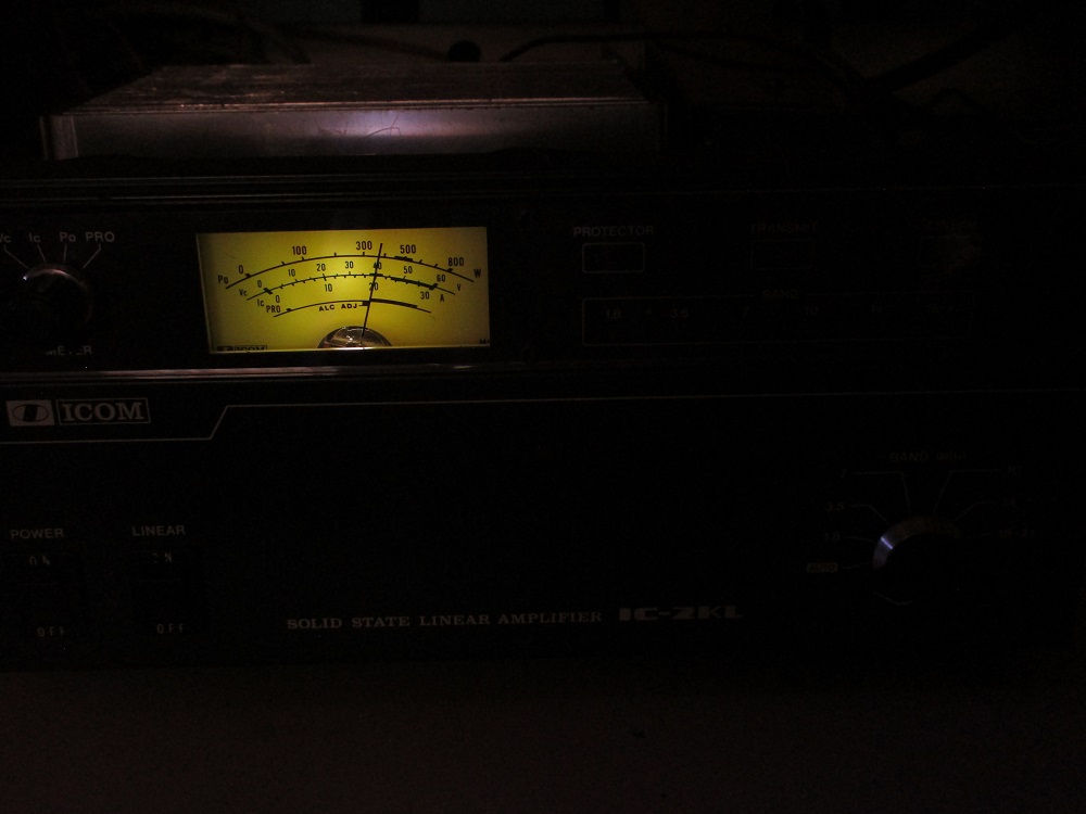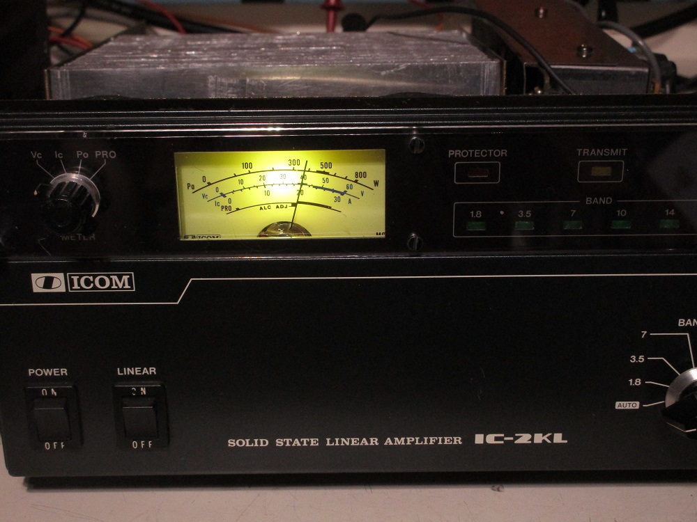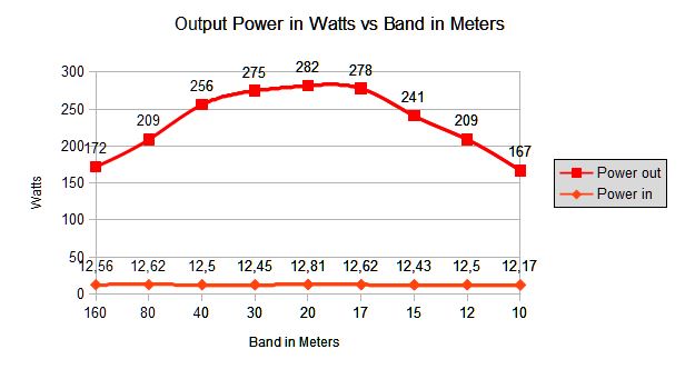 I replaced the HP6291A with an HP6274B lab supply which can supply +40 VDC at 18 A. With this change, a quick test across all bands with the Icom IC-7100 set for about 12 watts output gave this result. The gain variation is about 2 dB. No ALC was used.