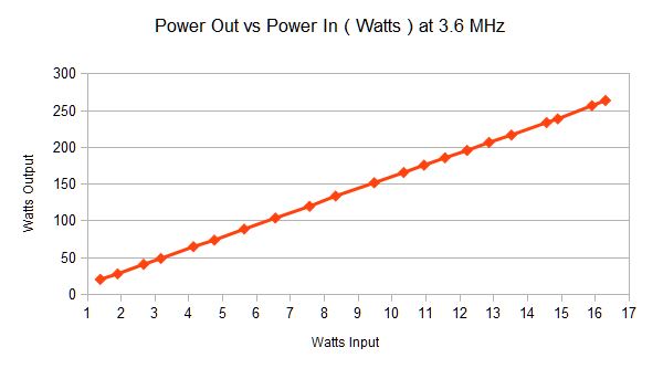 This is the power output versus power input as the output power of the Icom IC-7100 is varied from about 1.38 to 16.30 watts out.