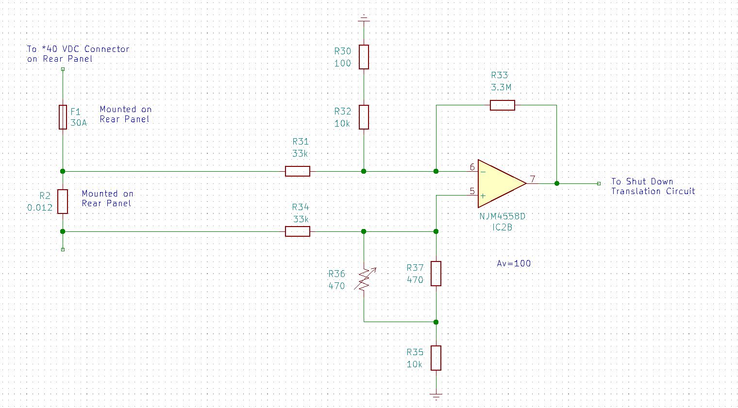 The voltage dividers formed by R30, 31, 32 and R34, 35, 36, and 37 reduce the input voltage of 40 VDC to about 10 VDC. The op amp, IC2B has a gain of 100.