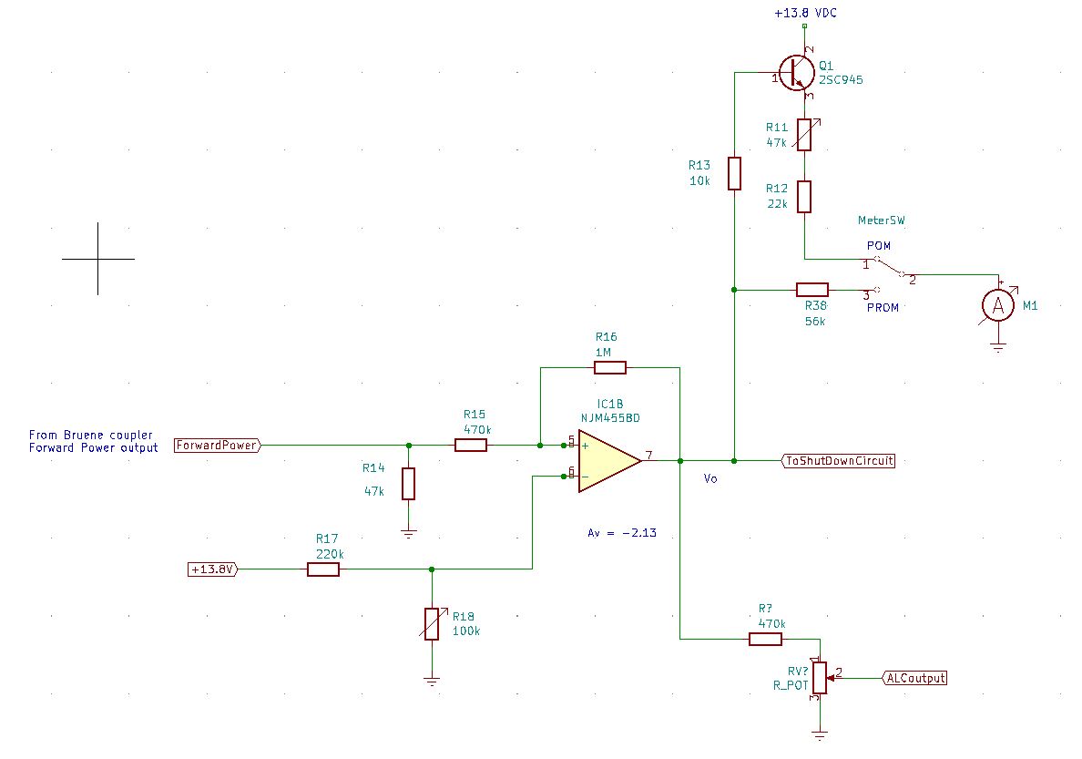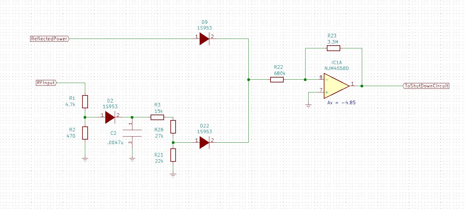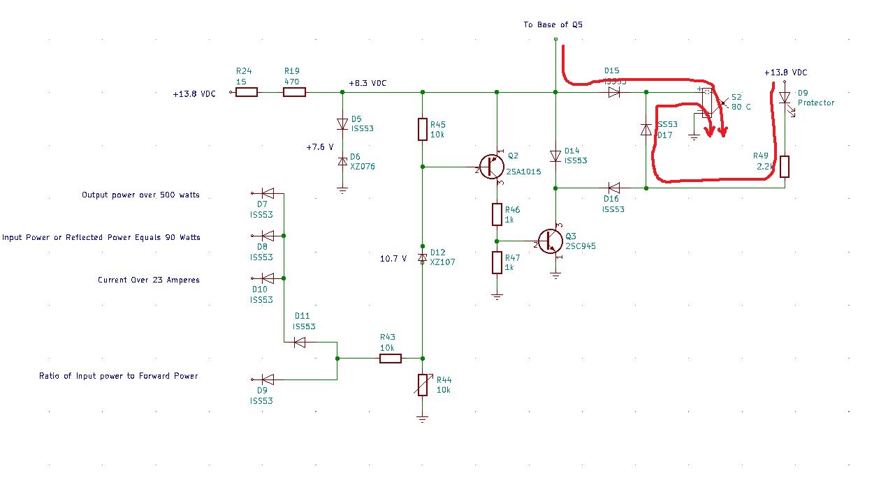 Below is a simplified diagram for the shut down circuit that compares the input power to the output power. According the the instruction manual. “IC2A detects a ratio of the output power and the driving power. If the ratio is less than 3:1, T13V will be shut off.”