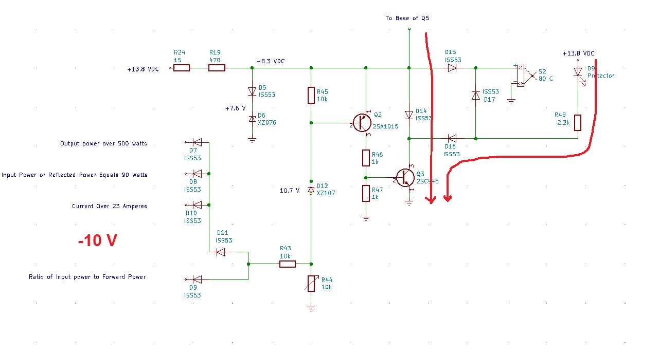 Below the more complex shut down works as follows. There are four conditions that can create a -10 V input to the diodes D7 through D11 which perform an OR function. If any of the four conditions results in a -10 V input to those diodes, the 10.7 volt zener D12 will bring the voltage at the base of Q2 down which results in both Q2 and Q3 turning on. Current will then flow as shown by the red lines with the red “Protection” LED coming on and current flowing through resistor R54 of the shut down circuit which will bring the base voltage of Q5 in the circuit to zero, which shuts off bias to PA1 and PA2