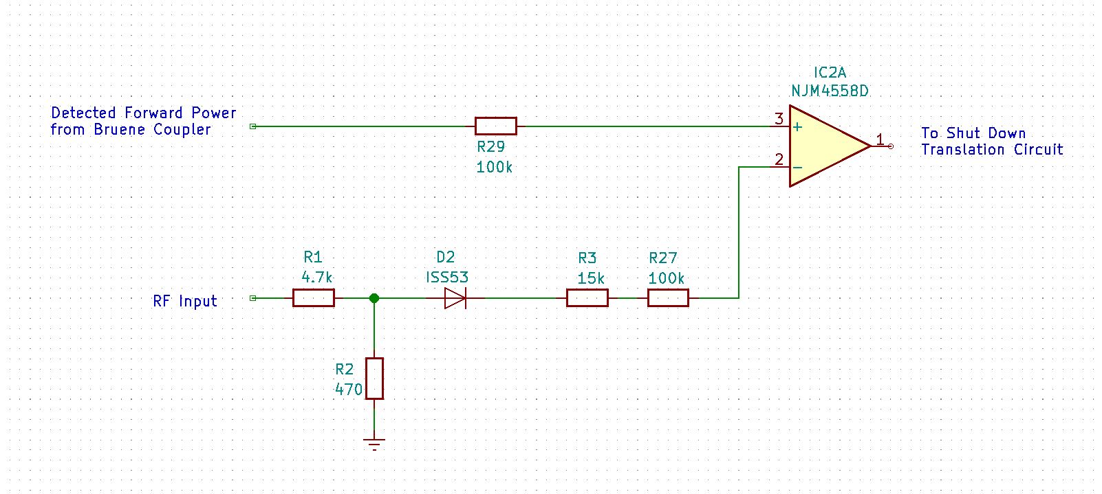 The detected forward power from the Bruene coupler is applied to the positive input of the op amp IC2A acting as a comparator. The negative input is the detected input power through a voltage divider consisting of R1 and R2.