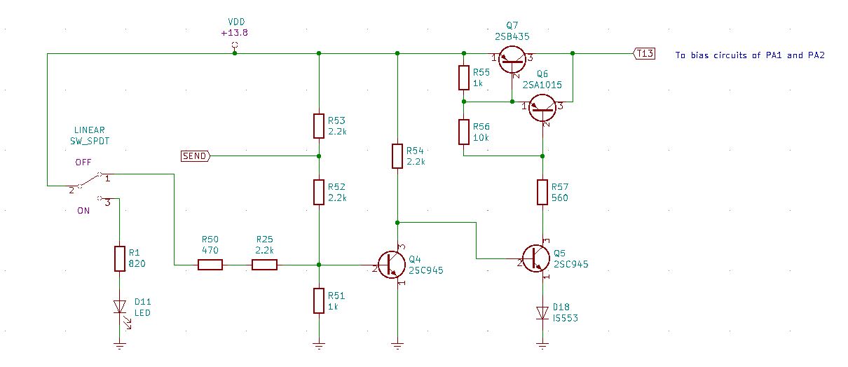 Posted earlier is the simplified shut down circuit below in which it was described that pulling the base of Q5 low would cut off the bias to amplifiers PA1 and PA2.