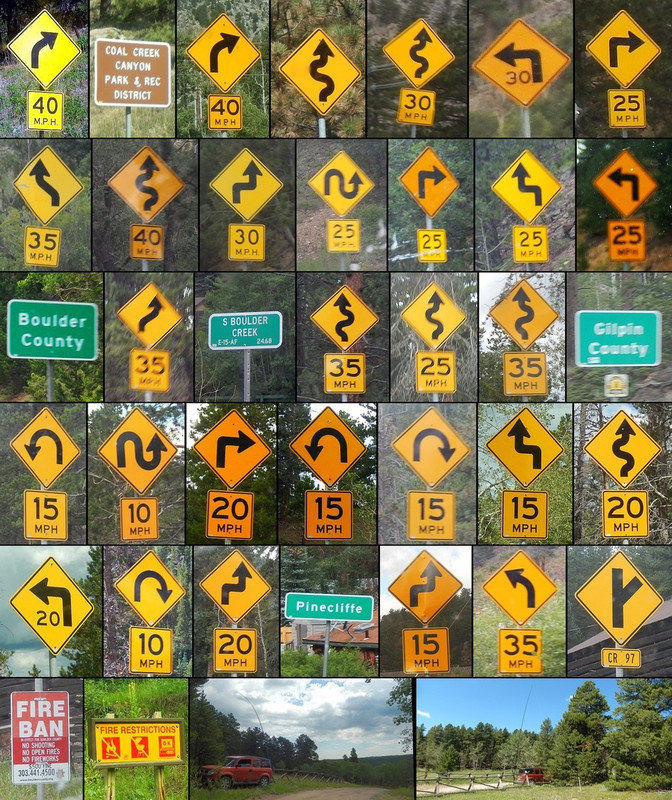 Road signs encountered going up the canyon to get to a place to operate in Roosevelt National Forest.