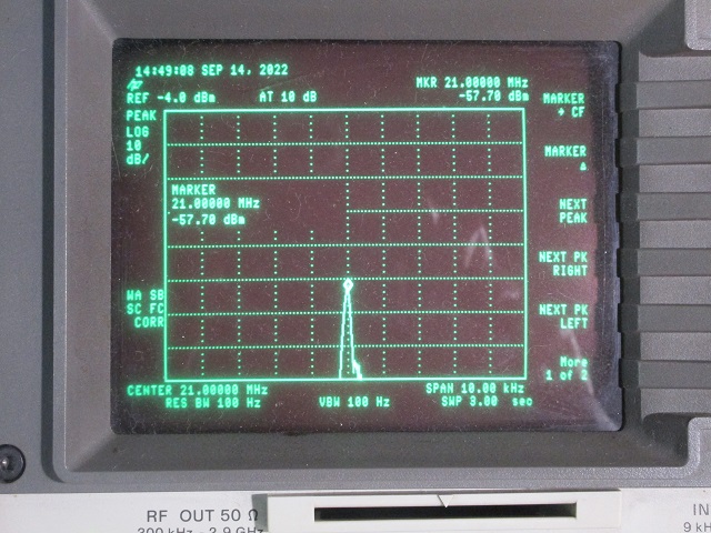 The Tempo One Clarifier has no gain calibration adjustment only an adjustment to set the “0” to the same frequency as when the Clarifier is off. To add a calibration adjustment a 500 k cermet trimpot was soldered across the end terminals of VR7 which is the Clarifier potentiometer. The cermet trimmer was then adjusted so that CW2 gave a +1.5 kHz offset. The measured CW1 offset was 1.312 kHz as shown below.