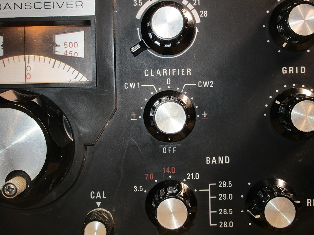 Below is a photo of the Tempo One front panel band switch and Clarifier. Bands with white numbers use a 9001.5 kHz carrier crystal. Ones in red use the 8998.5 kHz carrier crystal.