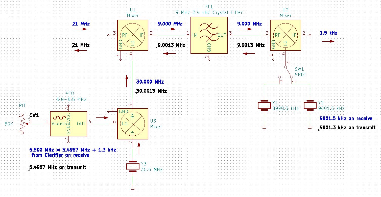 On receive, the incoming 14 MHz signal mixes directly with the VFO at 5 MHz to create a 9 MHz IF signal. The IF signal mixes with the 8998.5 kHz crystal oscillator to produce an audio output at 1.5 kHz.