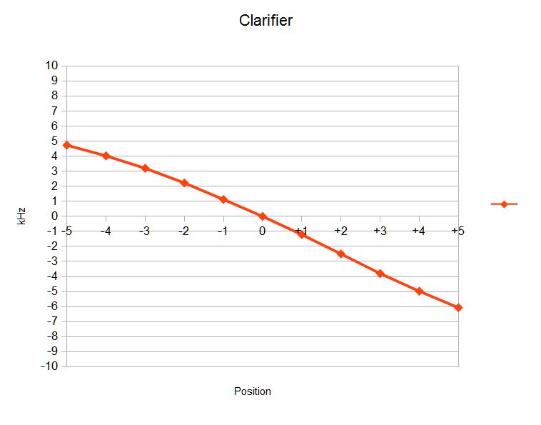 Although the CW1 position may appear on the front panel to be a 1.5 kHz offset it is not due to the actual characteristic tuning curve of the Clarifier shown below. The Clarifier turned counter clockwise from the “zero” position compresses so that CW1 which looks like 1.5 kHz is closer to 1.3 kHz.