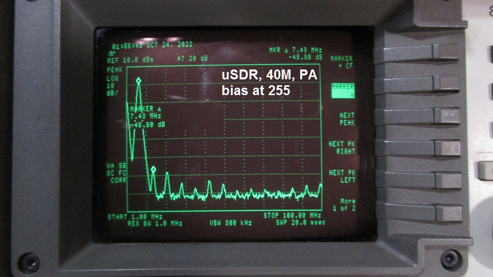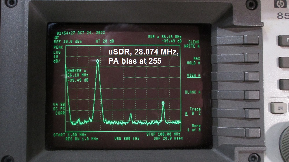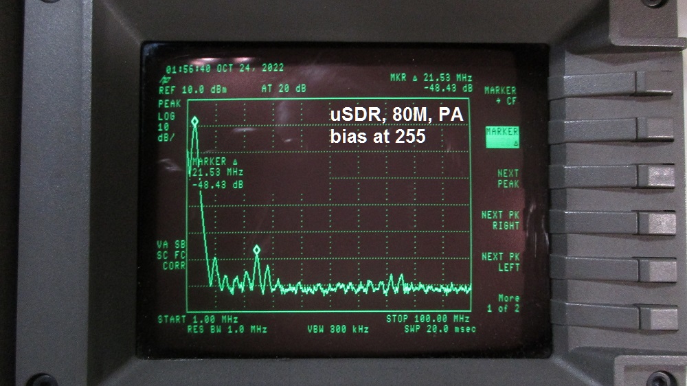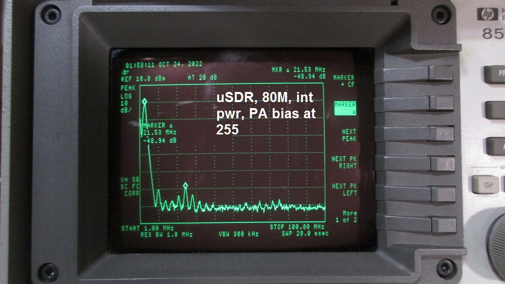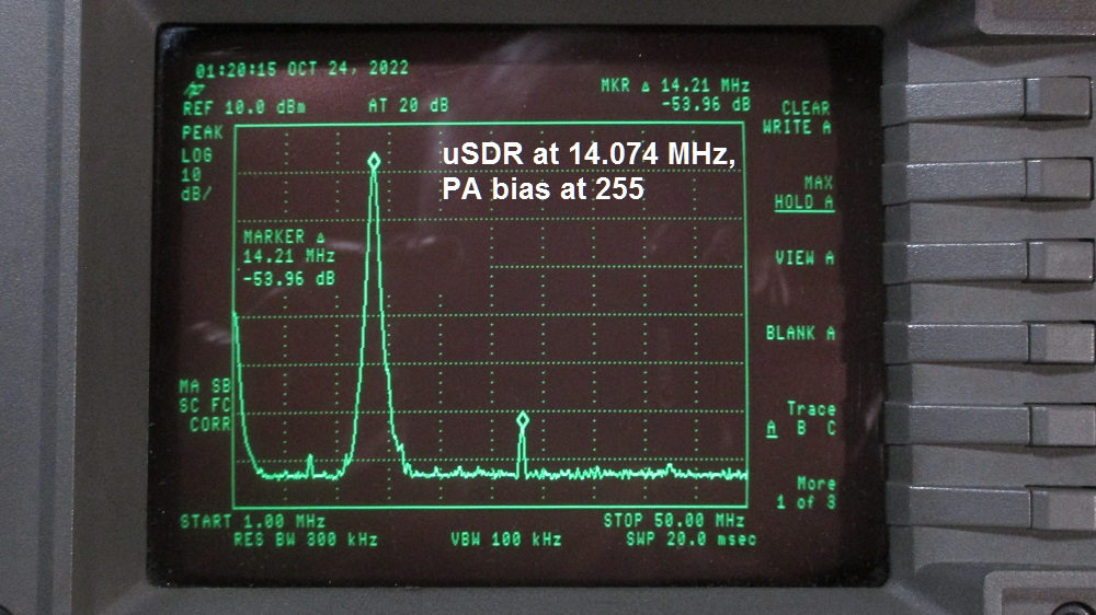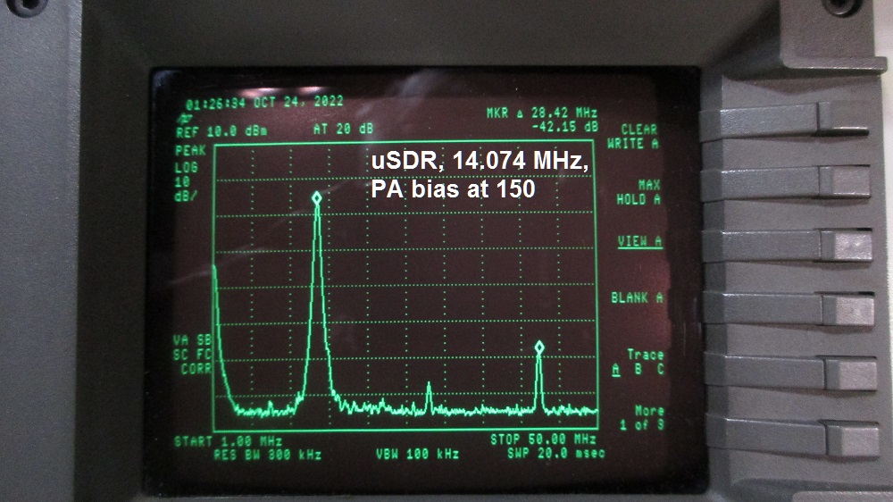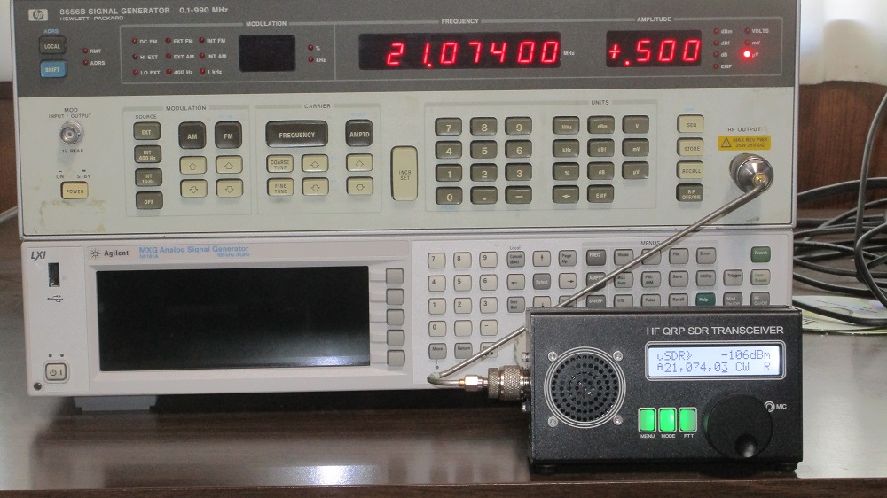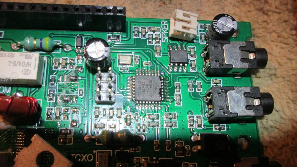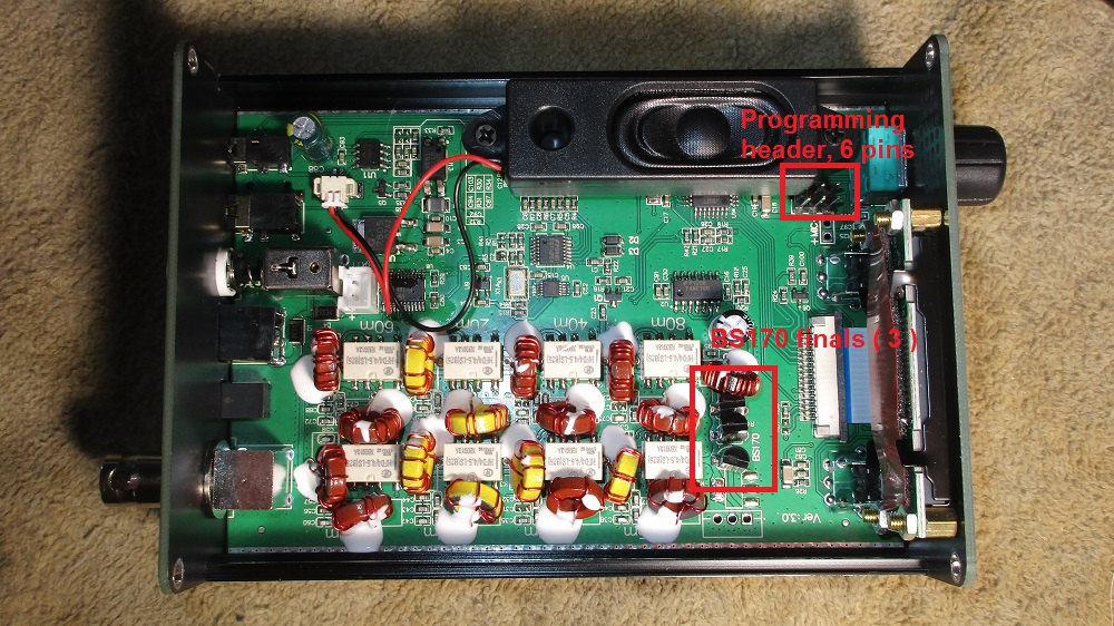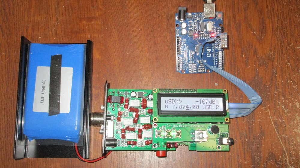 The uSDR was successfully updated to firmware version 1.02x. This was not a simple task. The programming six pin header is located under the LCD display. Access requires almost complete disassembly. I made a cable to connect the Arduino UNO acting as a programmer to the uSDR which fits under the LCD display. I went through the programming process three times. The first time, the 1.02x firmware was uploaded without any changes.