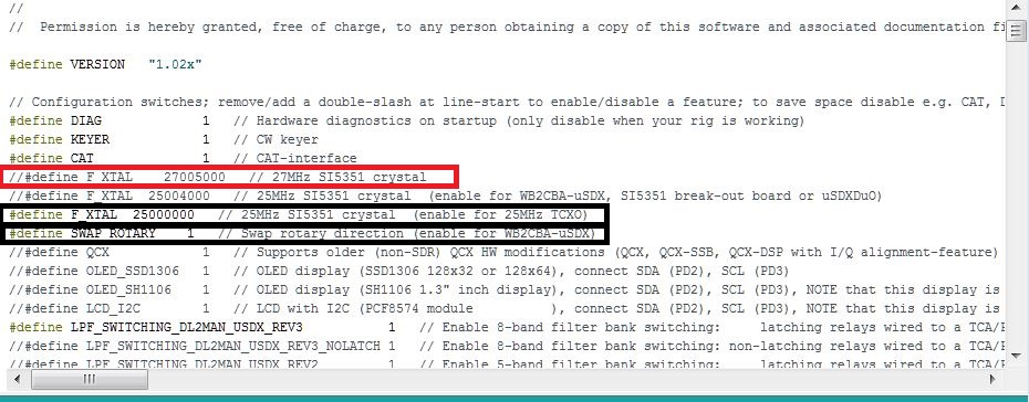 I was disappointed 1.02x leaves the tuning knob so that it turns clockwise to decrease frequency. The second and third uploads involve changes made to the firmware as shown below. To have the tuning knob increase frequency in the clockwise direction, the line beginning “#define SWAP ROTARY…” had two forward slash marks in front of it which converts it to a comment. I removed the // marks to reverse the rotation direction.