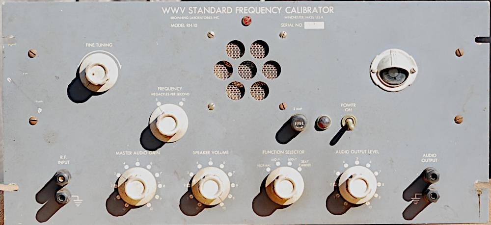 Full, accurate use of station WWV, the world's finest primary frequency and time standard, is obtained from the Browning Model RH-10 Standard Frequency Calibrator. The standard Browning RH-IO is pre-tuned for 5 and 10 megacycles per second reception, at sensitivities better than 1/2 microvolt on either band. A dual filter system provides selection of either the 440 or 4000 cycle modulation of WWV for use as a primary frequency standard.