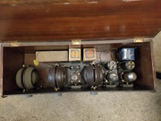 pity they painted the cabinet, hard to tell who made it. headphones or horn speaker (horn on a high-impedance "can" element), there were lots of radios built in the 20s that had a similar form factor to the Atwater-Kent 20. this one uses variometers instead of capacitors for stage tuning. with the 01A tube, 1.5 volt A battery and 45 volt B battery for the plates.