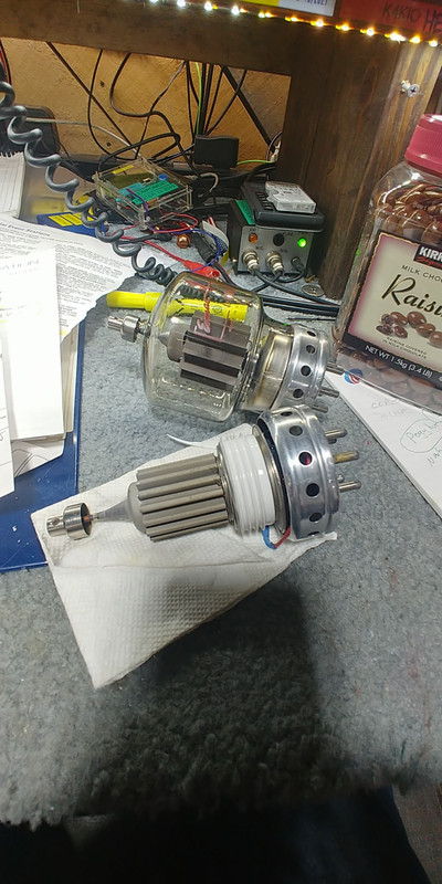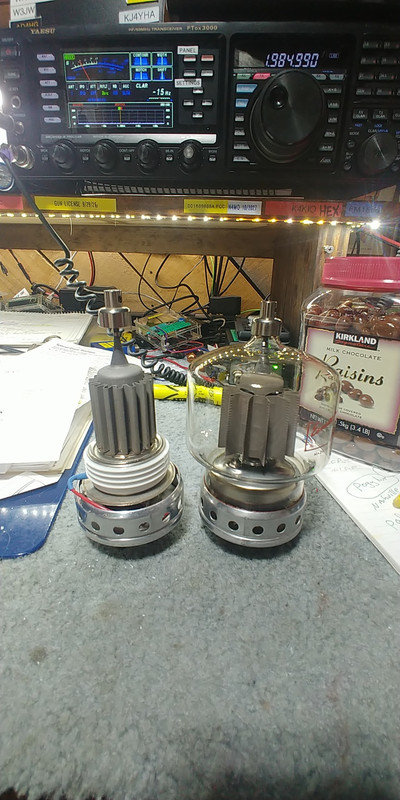 An 1.3 cu meters/minute flow (35.1 CFM) is needed to ensure proper forced air cooling, Iam just re-using the existing emiac glass chimney and so far have not seen any operational issues. The physical dimensions are very similar to the old 4-400, so the “plate lead” connects without issue, see photos. An added benefit is that the old screen voltage supply is not needed, so pulling the old OD3 voltage regulator tubes is recommended. Thought you might want to know about this **Static Induction Transistor (SIT) develop. I feel that having a HYBRID 1950 era transmitter is kinda cool and Ill be considering adding a pair of the SIT devices to my lnvader 2000 when I can save up the ca$h.